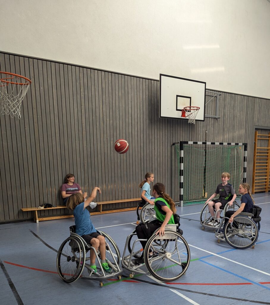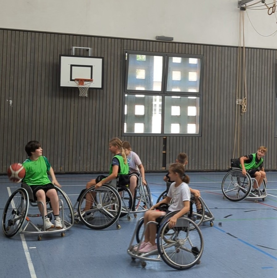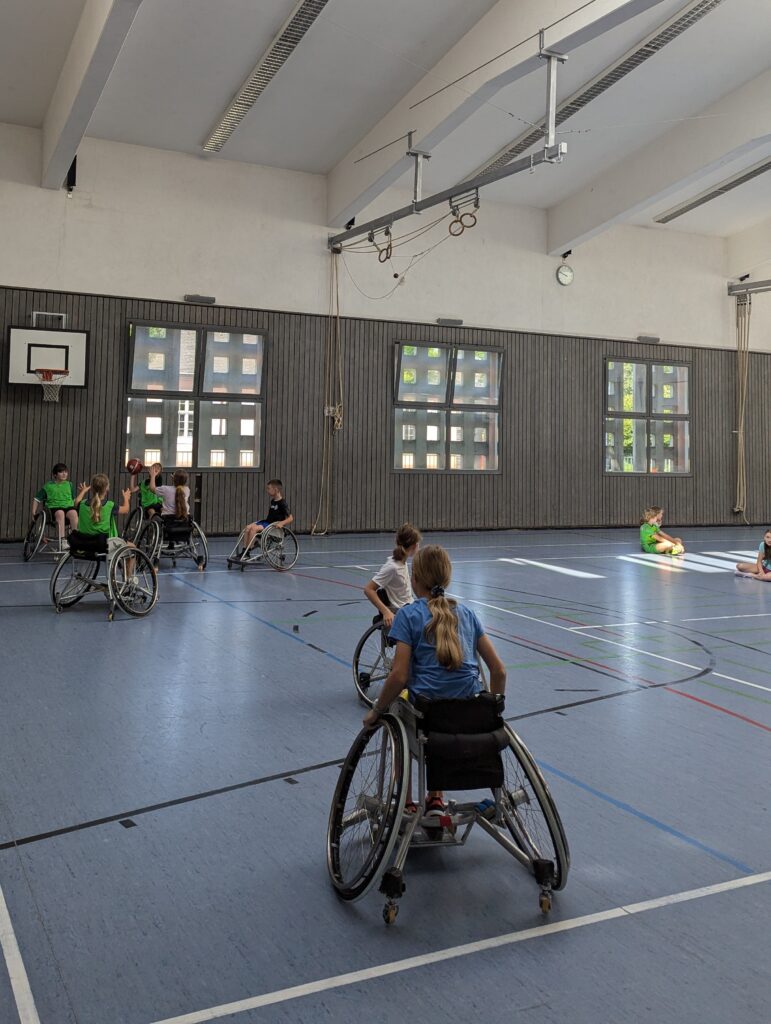 Unsere Verbindung zum Gymnasium besteht nun schon seit einiger Zeit – vor allem durch Nadjas Engagement, die die Kooperation maßgeblich mit aufgebaut hat. Mittlerweile sind wir ein fester Bestandteil des „Tag der Vielfalt“, an dem wir regelmäßig ein Rollstuhlbasketball-Try-out anbieten. Auch JJ und Nina waren dort bereits letztes Jahr brereits aktiv im Einsatz.